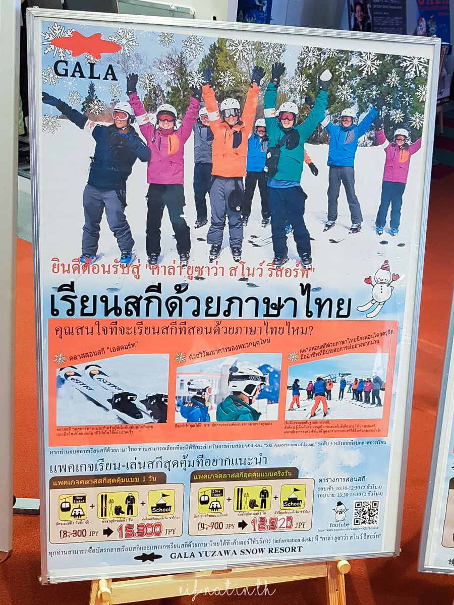 นั่งมาจนสุดสายที่สถานี Gala-Yuzawa มีป้ายภาษาไทยตัวใหญ่ไว้ต้อนรับเลยทีเดียว เราเลือกซื้อแพ็คเกจ JR Pass Snow Fun Set คนละ 4,500 เยน จะได้ ตั๋วไปกลับ Gondola + Rubber Boots + Sled + Snow Fun Tour