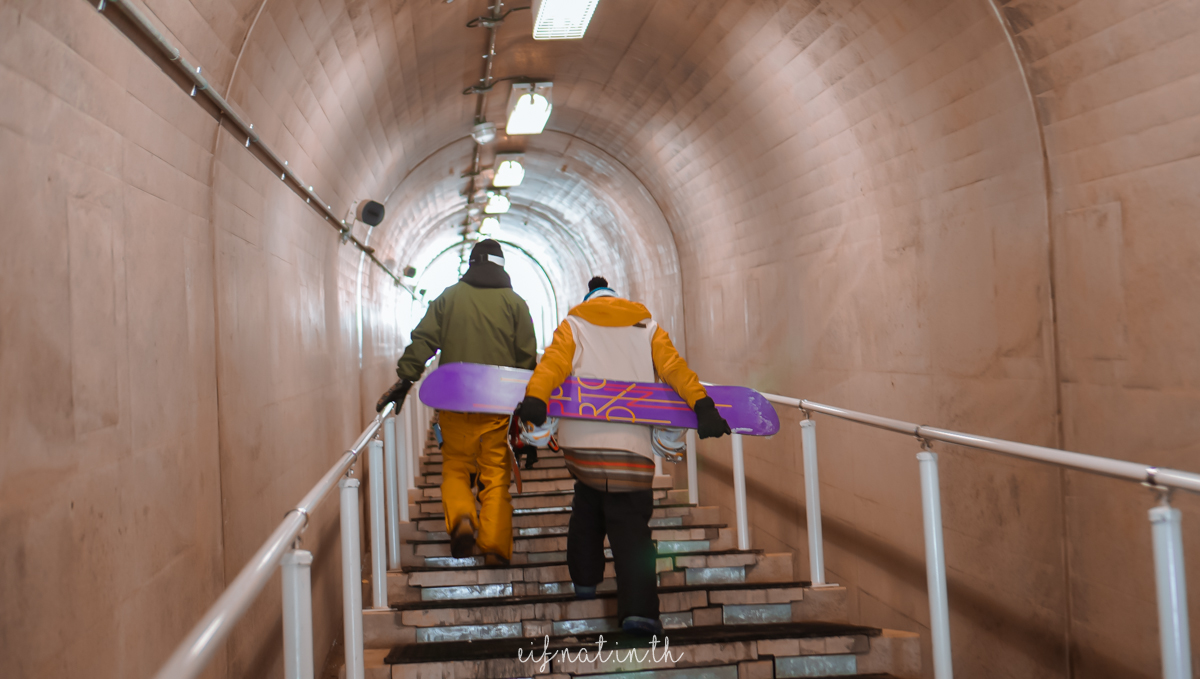 พอได้รองเท้าแล้ว ก็ไปฝากของไว้ใน Locker น่าจะเสียตังค์ด้วยนะ แยกเป็นส่วนชาย/หญิง อิฟเลยฝากรองเท้าไปกับพี่นัท จากนั้นขึ้นกระเช้า Gondola ไปที่ Cheers Station เพื่อแลก Sled