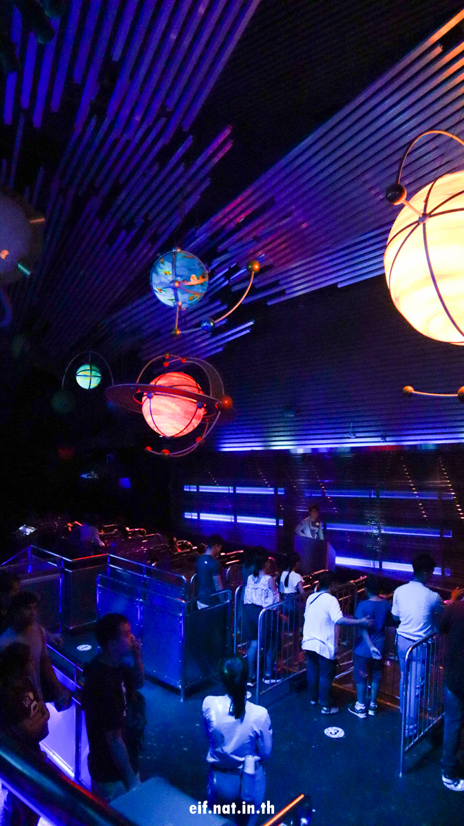 ส่วนอันต่อไปนี้โลดโผนมาก ไม่รู้มาก่อนว่ามันจะเป็นรถไฟเหาะ เหวี่ยงๆในที่มืด มีเพียงแสงสว่างจากกระสุนบลาสเตอร์ 555555 HyperSpace Mountain สนุกโว้ยยยย เหมือนอยู่ในหนัง StarWars ไฟท์กับฝ่ายจักรวรรดิ อินจัดบอกเลย ตอนแรกเข้าไปเจอป้ายว่าไม่เหมาะกับคนเป็นโรคหัวใจก็ เอาแล้ว (1) ได้ที่นั่งละ ยานวิ่งออกไปในที่มืด ปรับสายตาได้มองไปรอบๆ อ้าว…รางคดเคี้ยวจัง (2) พอมันเร่งสปีดเท่านั้นแหละ อหหหห. #พีคคค